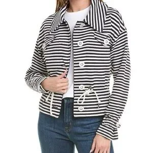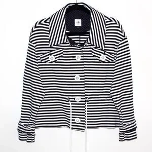 Cabi "Harbor" Cinched Waist Navy and White Striped Jacket. Nautical-themed jacket by Cabi. A nod to the 80s, it's cut with dropped shoulders and a roomy, slightly boxy upper half that tapers gorgeously into a cinched waist for an hourglass silhouette. Cabi adds extra triangular panels of fabric under the arms for a really cool, exaggerated shape that's reminiscent of 80s windbreakers and high-fashion jackets. Nautical navy and white stripes are a fun, classic pattern, giving this a summery, coastal vibe. The white drawstrings lend a ton of flexibility.