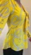 This Reef Knot nautical Blouse from Cabi features a nautical rope and anchor print on bright yellow, a fitted waist, a slim fit, a concealed left side zipper, an empire tie at the front, long bell sleeves, wide cuffs with three button closure, and a plunging V-neck.