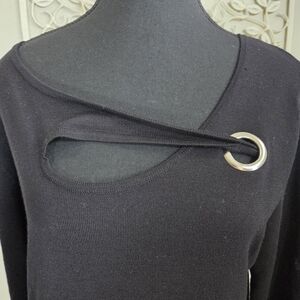 Stylish black long sleeve sweater featuring a unique cutout detail. Perfect for any occasion. Length 24" Bust 44" Sleeves 19"
