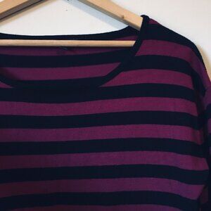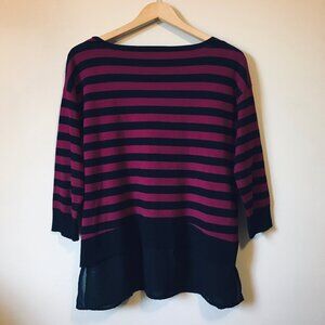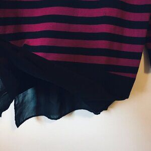 Very good preowned condition bilayer knit malbec/burgundy and black striped, long sleeve top with black chiffon insert at hem by Cable & Gauge. Chiffon is only sewn in at the hips and doesn't go all the way up the body.
