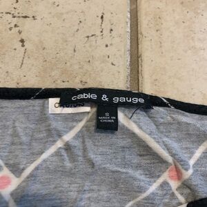 Cable & Gauge, tunic top, asymmetrical hem, geometric pattern, black and white, red accents, long sleeve top, button detail, casual top, stylish blouse, size small, S.
