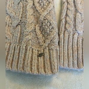 Stay cozy and stylish with this elegant cable knit sweater. Perfect for any occasion, this beige and light pink sparkly sweater adds a touch of warmth to your wardrobe.