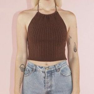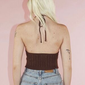 Cable knit halter tank top. Open back and tie straps. Brand new with tags in a size large. Pretty stretchy and soft. In a beautiful brown colour and purchased from Crybaby.