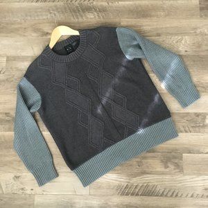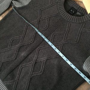 Good preowned vintage condition, dark grey and light grey, cable-knit front, ribbed-sleeve, crew neck, chunky fisherman sweater by Armani Exchange. Labelled as a men's, but can be worn unisex. Not in perfect condition, but still a very nice eco-friendly piece.
