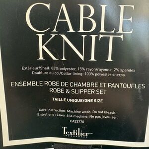 Cozy cable knit robe and slipper set. Features soft textures in gray and cream.