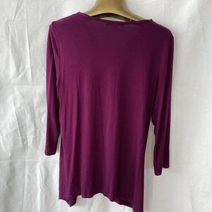 Asymmetrical hem, round neck, 14” front zipper, 3/4 length sleeve, viscose spandex, EUC, neck to hem 26”, armpit to armpit 16”, armpit to cuff 14”. Purple plum colour.