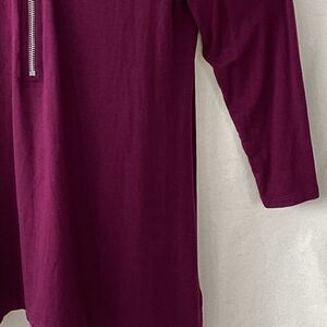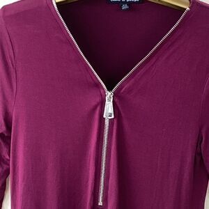 Asymmetrical hem, round neck, 14” front zipper, 3/4 length sleeve, viscose spandex, EUC, neck to hem 26”, armpit to armpit 16”, armpit to cuff 14”. Purple plum colour.