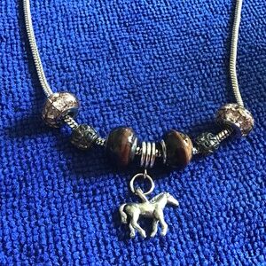 For the horse lovers ! A sweet necklace featuring 4 round glass beads and a charm representing a horse.