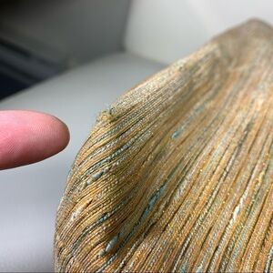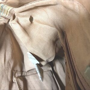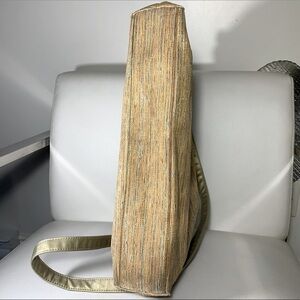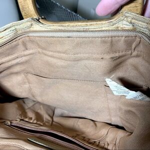 In Great conditions, nice material Beige blue and gold threads. Wooden handles, clip shoulder strap zippered bag. Tiny fabric flaw bottom corner and small hole inside Please see pictures