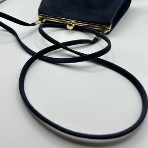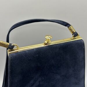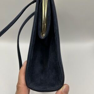 Cabrelli vintage crossbody bag. Navy blue suede. Gold hardware. Clasp closure. One inner pocket. Made in Canada.