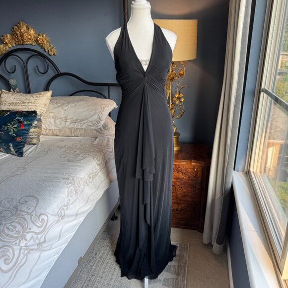 Caché black halter floor length evening gown with open back and rhinestone accents, size 2. Rhinestone accent at bust line and rhinestone strap across open back, Gather and twist at waist, draping down center. Stretchy material, zips at size. Missing a few rhinestones at back but very hard to tell as shown in photos, fabric at back has pulled from each other as shown in photo 14. Bust measures 15 inches laying flat, waist measures 12 inches flat, hips 17 inches flat, length from shoulder to hem is about 59.5 inches. Cat friendly, nonsmoking home.