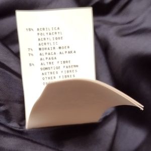 Fabric is wool, acrylic, mohair and alpaca. Darker photos are more accurate. It's a tweedy blue-green with flecks of white.