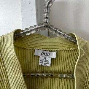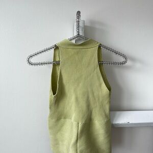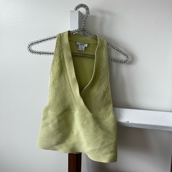 Cache ribbed halter top in lime green. Stretchy knit fabric with deep V neckline. Sleek fitted silhouette. Stylish for layering or wearing alone.