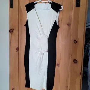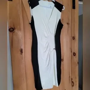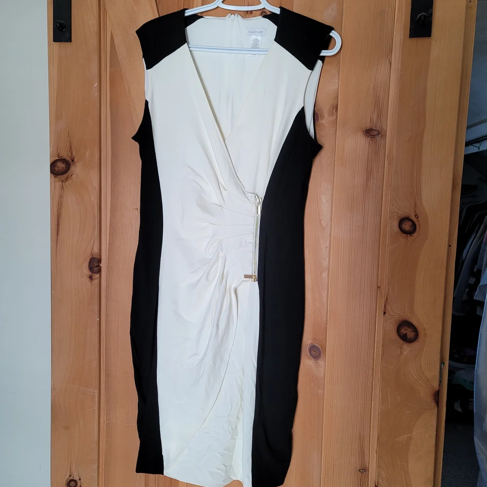 This Cache midi dress features a sleek black and white colorway with a stylish ruched front and a gold zipper accent for a polished, fashion-forward look. The sleeveless design adds a contemporary touch, while the nylon and spandex blend provides a slightly stretchy, fitted silhouette that flatters your shape.