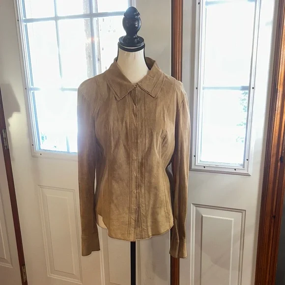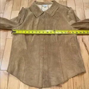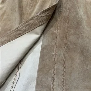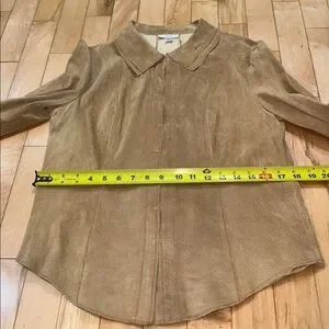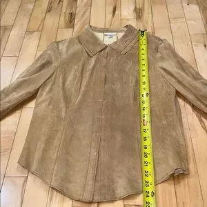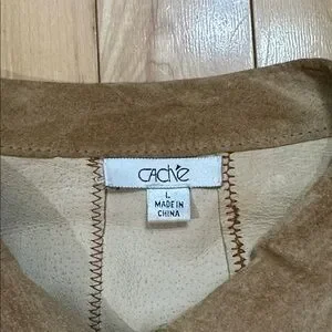 Size large. Cache. Elegant suede top with a soft texture. Features a double collar. Hook and eye closures up the front. Slight bell at sleeve cuffs.
