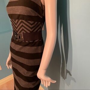 This dress is in excellent condition. Black and charcoal grey horizontal stripes with a chevron pattern around the waistline. Has removable belt that comes with the dress. One of the silver pieces is missing on the one side of the belt (does not affect function). Has invisible zipper up the back. Size 0