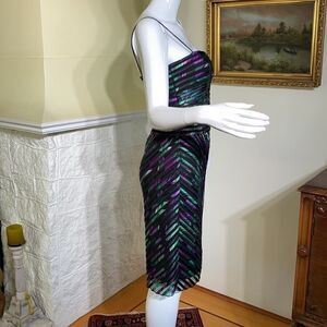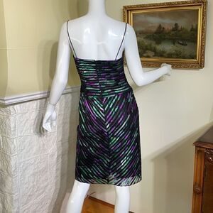 In excellent preowned condition gorgeous sexy but still very elegant bandage style cocktail dress, stunning combination of colours featuring a black base with purple and green tones. Bustier style top with built in boning, thin spaghetti straps and back zipper. This is such a flattering dress!