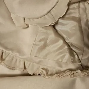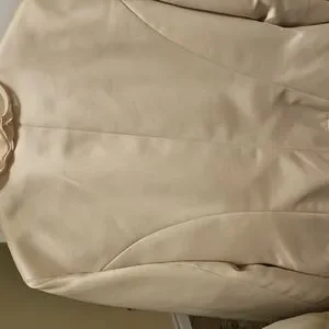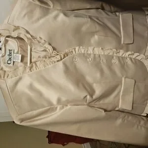 Elegant cream blazer with ruffled trim and button details. Perfect for formal occasions. Silk. Handwash only.