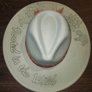 This soft green faux felt hat is hand burned with cactus' or cacti's (what's the proper way to spell that!?!?!) and succulents. Paired with a nice fabric to add a little distressed vintage look. There are adjustable ties to accommodate a variety of sizes.