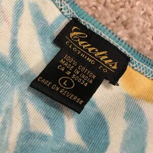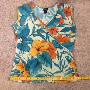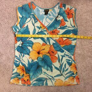 Very good preowned condition, 100% cotton, faux wrap, Hawaiian orange hibiscus, tropical paradise beach top with raglan almost cap sleeves by Cactus. Black sequins sewn on throughout. Gorgeous complimentary colours. Awesome.