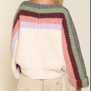 Wrap yourself in cozy comfort with this chunky knit striped sweater, crafted from a soft wool blend with a touch of spandex for stretch. Featuring raw seam detailing along the center front and back, this sweater adds a modern, effortless edge to its bold, multi-color stripe design. The oversized silhouette and wide sleeves make it the perfect statement piece for winter layering.