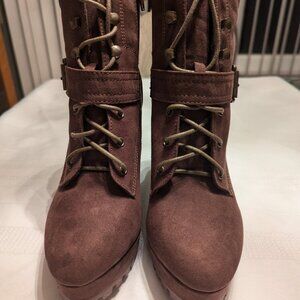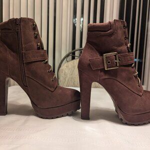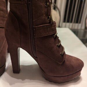 This is a stylish, high-heeled ankle boot with a brown suede-like finish in excellent condition (never worn). It features a platform sole and a tall, sturdy 5 inch block heel. The design includes a lace-up front and a decorative strap with a gold-toned buckle that wraps around the ankle. The boot also has rugged treading on the sole, adding functionality to its fashionable appearance.