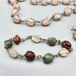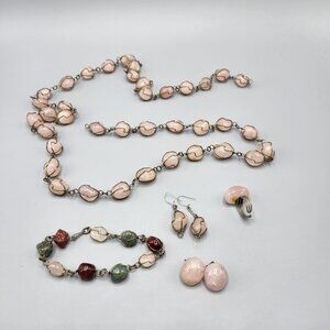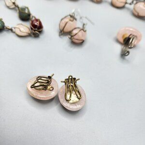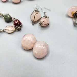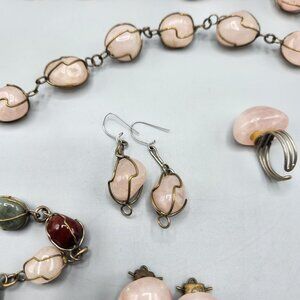 A set of wire wrapped jewelry. The necklace is rose quartz and measures 36" in length. The two pairs of earrings and the ring are also rose quartz. The bracelet has other polished stones in it and measures 8" in length. In excellent condition, please review photos closely.