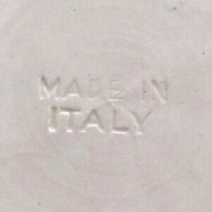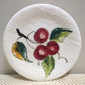 Cake Plate Serving Set from Italy. Features a beautifully crafted 11.5" cake serving plate, four matching 7.5" individual plates, and a cake knife. Made of ceramic with a raised linen texture background and a vibrant fruit theme decoration, this vintage six-piece set is perfect for all occasions. Showcasing exquisite craftsmanship and attention to detail, this original Made in Italy brand piece will add a touch of elegance to your table setting. Ideal for serving desserts or displaying as decorative cookware, this set is a must-have for any collector of unique pottery and glass items.