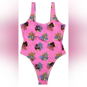 Major 80's beach vibes alert! Dive into sun-soaked adventures with this Barbie California Swimsuit! This swimsuit is your ticket to turning heads at the beach or by the pool, with its bright colors and stand out all-over print pattern featuring Barbie, Ken, Midge and Christie, this swimsuit is an 80's Barbie fan's dream. Featuring a square neck and a flattering high leg cut.