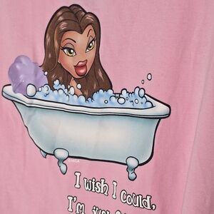 Pink cropped tank top featuring a graphic of a Bratz doll in a bathtub with the text "I wish I could. I'm just SO busy!".