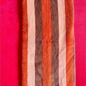 Soft vintage bath towels with bold stripes. Features orange, brown, and cream colors. Perfect for adding a retro touch to your bathroom. In excellent condition!
