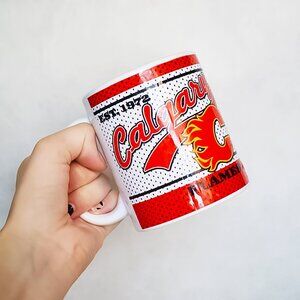 Hand-poured unscented Calgary Flames hockey team mug candle. Made using a second-hand mug and upcycled wick, this candle is the perfect decor to show your team spirit! Once your candle is finished, clean out the leftover wax, and enjoy your new mug.