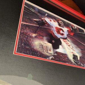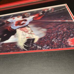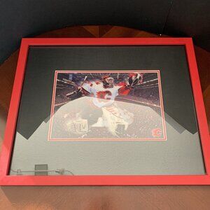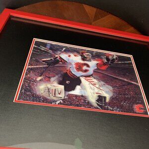 This is a 3D lenticular framed print featuring legendary Calgary Flames goaltender Miikka Kiprusoff. The dynamic image showcases Kiprusoff in action, with the iconic “Sea of Red” crowd in the background, creating a captivating visual effect that shifts as you move. Professionally double-matted in black and red and housed in a bold red frame, this piece is a must-have for any Flames fan or hockey memorabilia collector.