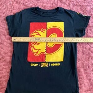 Fair used condition due to some warping to sides of tshirt and a small whitish scuff stain towards bottom not noticeable if tucked in . Great for NHL fans. Vintage circa 1995 Calgary Flames women’s size small t-shirt top short sleeve by Adidas 100% cotton made in Mexico