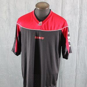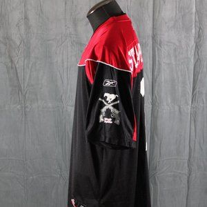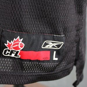 Up for sale is a retro Calgary Stampeders jersey by Reebok. It has a red top portion and sleeves with a black body underneath. Each sleeve has the Stampeders alternate 6 shooter logo screened on. The back of the jersey has the number 1 and Stampeders crested on in white. What a great jersey do not miss out on it.