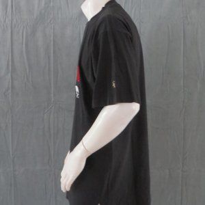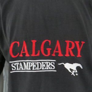 Up for sale is a Calgary Stampeders shirt. This shirt dates from the early 1990s is made by Soft Wear of Canada. It features a black base colour. The logo and script graphic are stitched into the shirt. What a great game day shirt for any Stamps fan.
