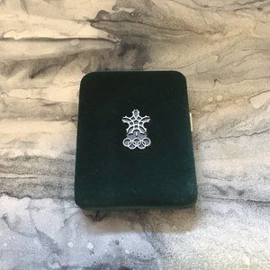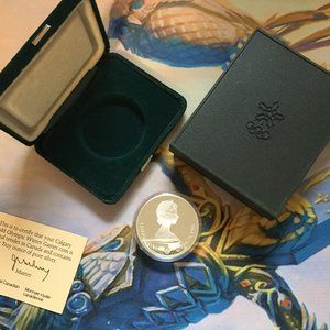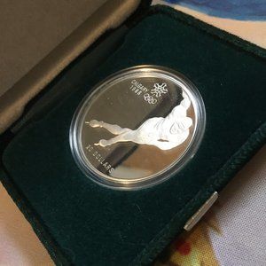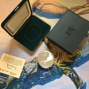 This is a good condition, royal Canadian mint silver medallion from the 1988 Winter Olympics hosted in Calgary, featuring a speed skater rendered by Friedrich Peter. Comes with a green felt case featuring the Olympic logo, a numbered and signed certificate of authenticity, as well as a green plastic hard shell case. Medallion itself also has a round case and is about 1.5" in diameter. Could use a slight polish (I will leave that to professionals), but otherwise in great condition. Includes very rare case.