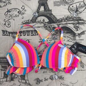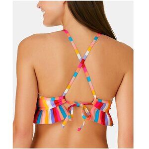 Brighten your beach look with this fun top from California Waves, in candy-color stripes with a ruffled flourish at the front and a chic strappy back.