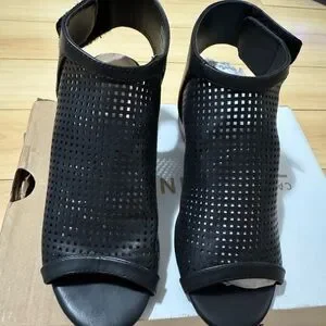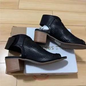 Chic black peep-toe heels with cutout design. Ideal for a stylish look.