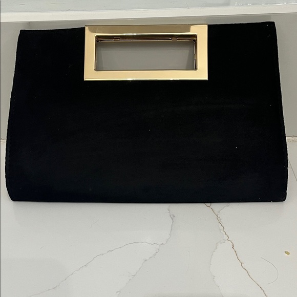 Chic black clutch with a gold handle. Perfect for evening outings.