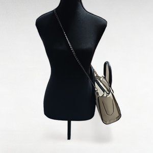 The Call It Spring tote handbag in black and cream features a cream-colored fabric lining with one slip and one zippered pocket inside. Clean interior without rips or stains. Its gusseted sides, black metal hardware, and faux pebbled leather construction offer durability. The bag includes a black footed bottom, embossed black handle straps, measures 8" x 7.5", and comes with a 40" black gunmetal curb chain crossbody strap. Despite storage-induced creases, it's in very good condition and these should resolve with use.