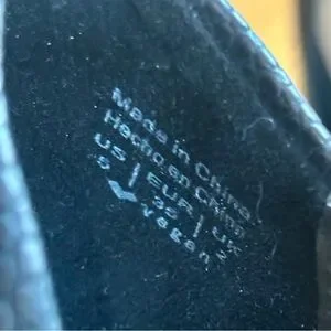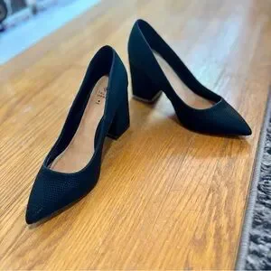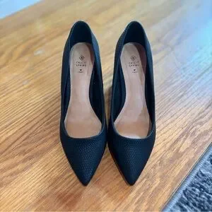 Size 5 Call It Spring, black vegan leather heels with gold accents. These heels have only been worn a few times for formal events and sadly don’t fit me anymore. The heel on these is about 3 1/2 inches tall. They are incredibly comfortable (for heels) as they have a cushioned insole and the heel is quite chunky. Perfect for someone with tiny feet looking for a comfy heel for any occasion!