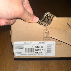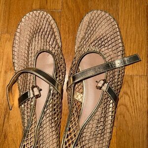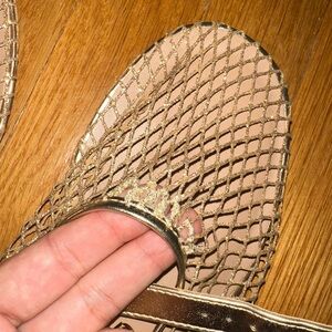 Call It Spring mesh flats in sparkling gold. Bought them this summer, and wore 1-2 times. Small tear evident in third photo, but sewn for repair. material is delicate, but very cute for outfits.