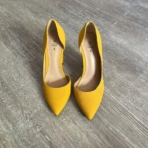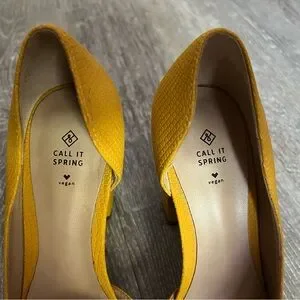 Elevate your look with these mustard yellow heels from Call It Spring. Features a textured finish and block heel design.