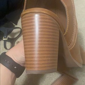 Open toe slip on ankle heel in a luggage brown colour. Elastic on the sides for easy pull on. A little bit scratches on the heel. And wrinkles on the pleather area. Only worn a handful of times.