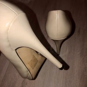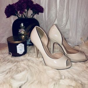Nude pumps that will match every outfit! Worn only once to my prom, a few years ago, very comfortable despite the high heel of 4.75 inches. On the left heel there is a tiny scratch, but barley visible (see last photo). Made of faux patent leather, very light nude that will embellish your shoe collection.❤️