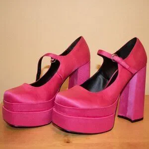 Bold pink platform heels. Chunky heel design. Mary Jane strap detail.