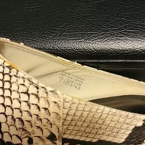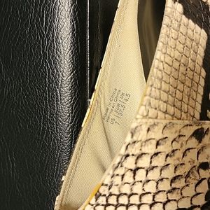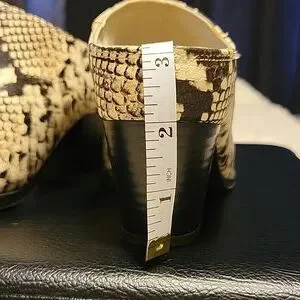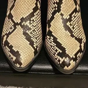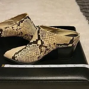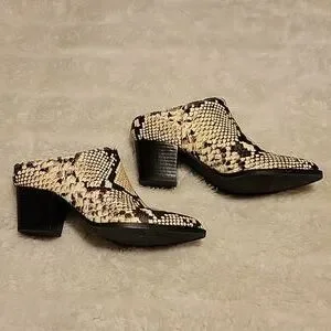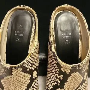 Call It Spring vegan leather mules in a beige and black python print. They are a size 7 and on the narrow side.
