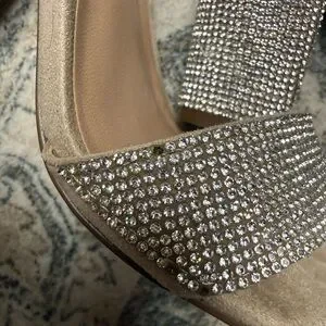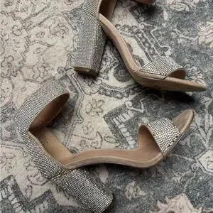 Glittering rhinestone straps. Chunky block heel for stability. Open toe with sleek silhouette. Dressy sparkle for evening wear. I think a few stones are missing but hard to see .