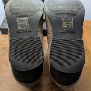 Some wear on heels (see pictures) and light staining on inside of right boot but still has at least another season of wear left.